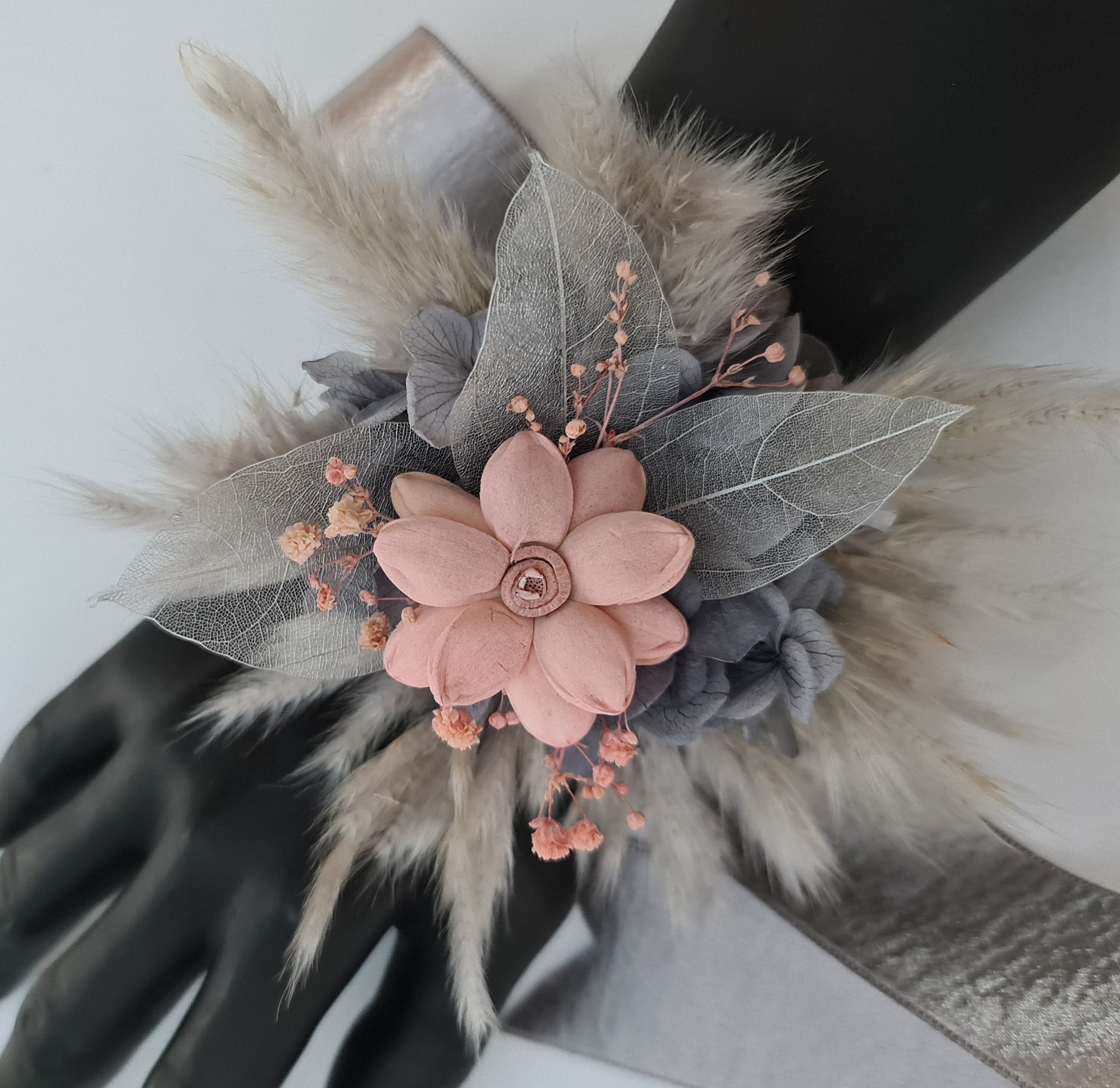 Preserved flowers fluffy silver & blush pink corsage with leather look silver ribbon