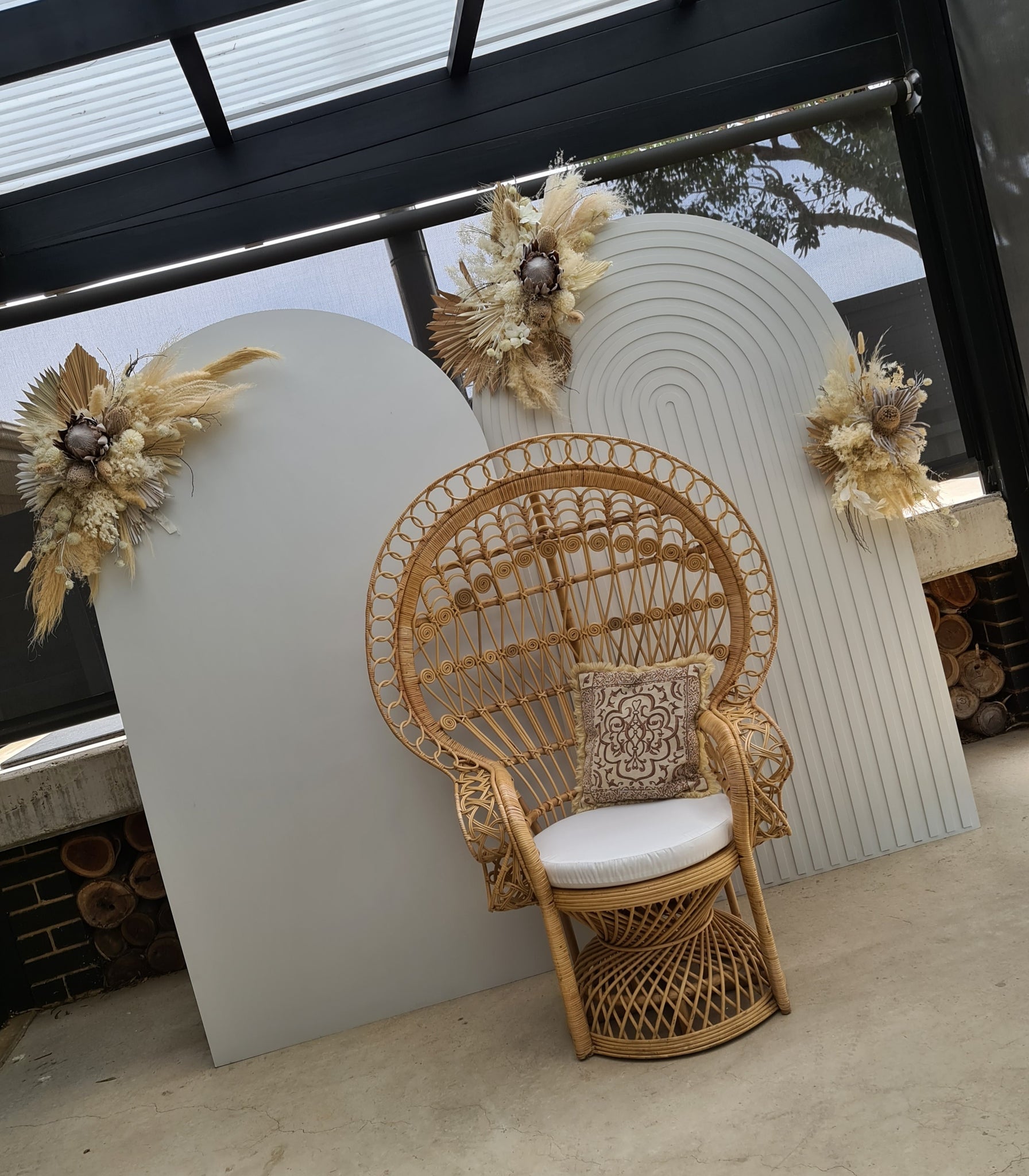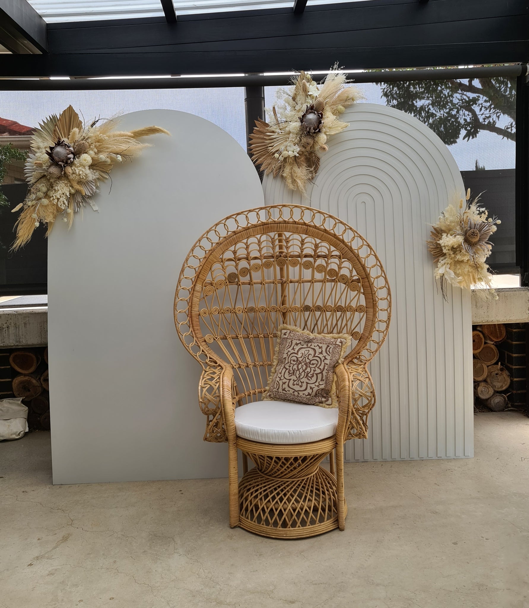 Two white backdrops / arches & 3 x boho flowers & Queen Peacock chair