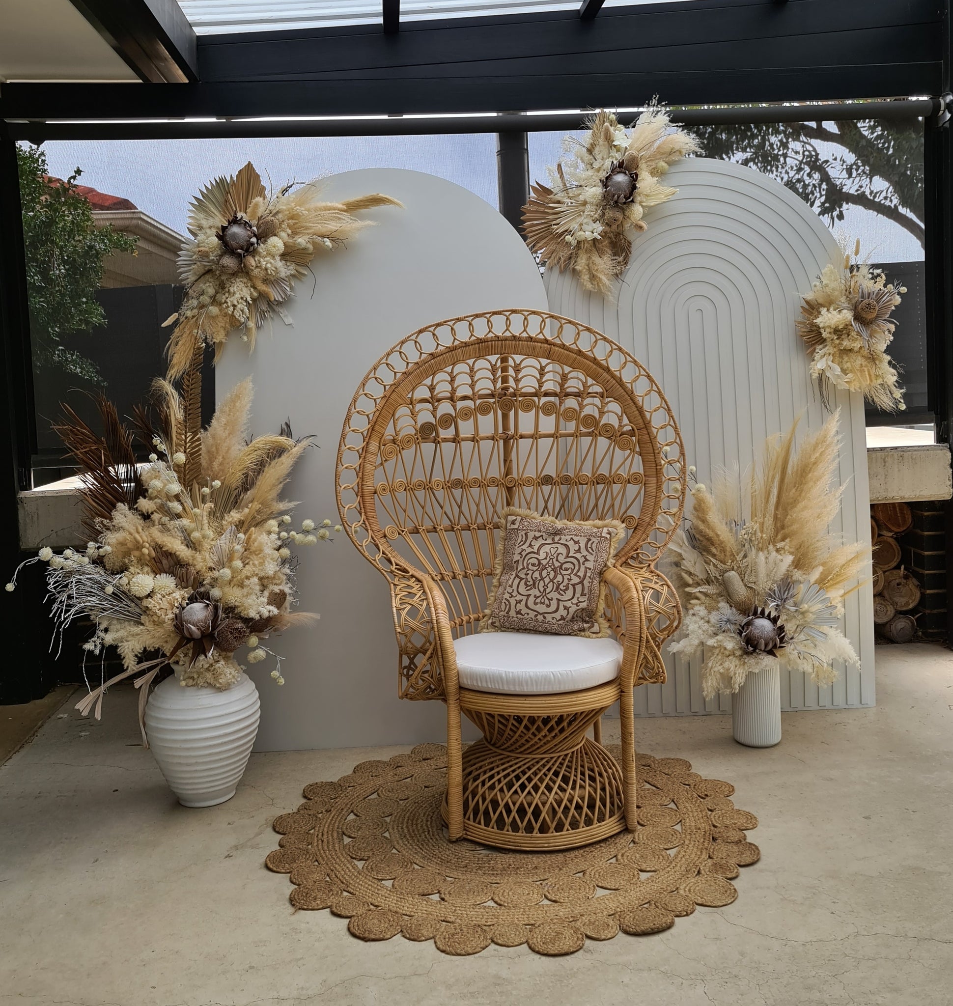 Two white backdrops / arches & 5 x boho flowers & Queen Peacock chair - HIRE ONLY