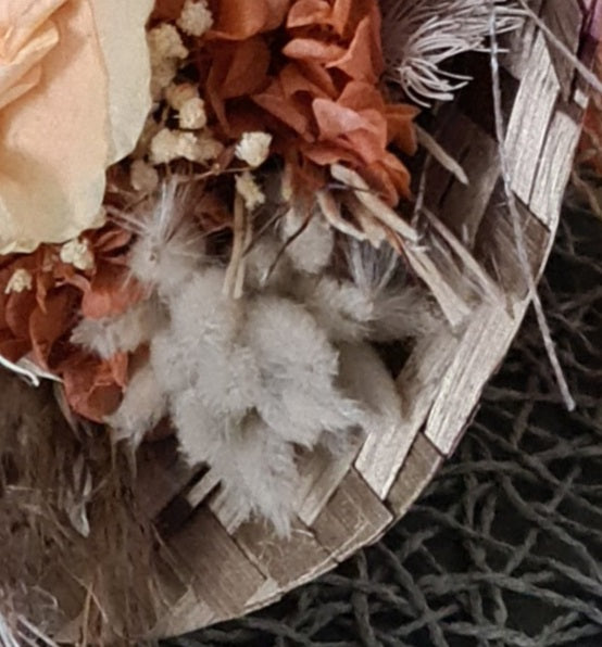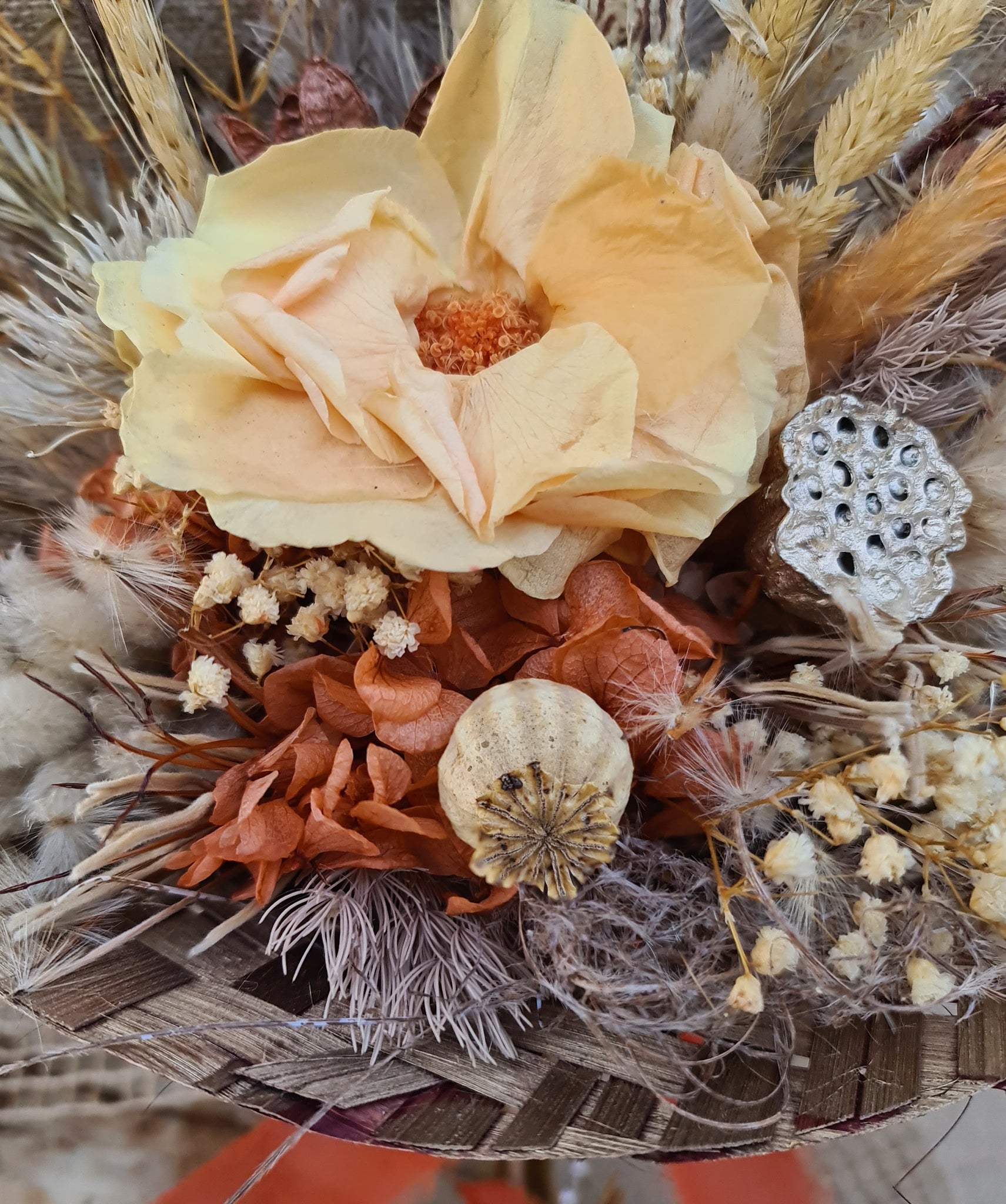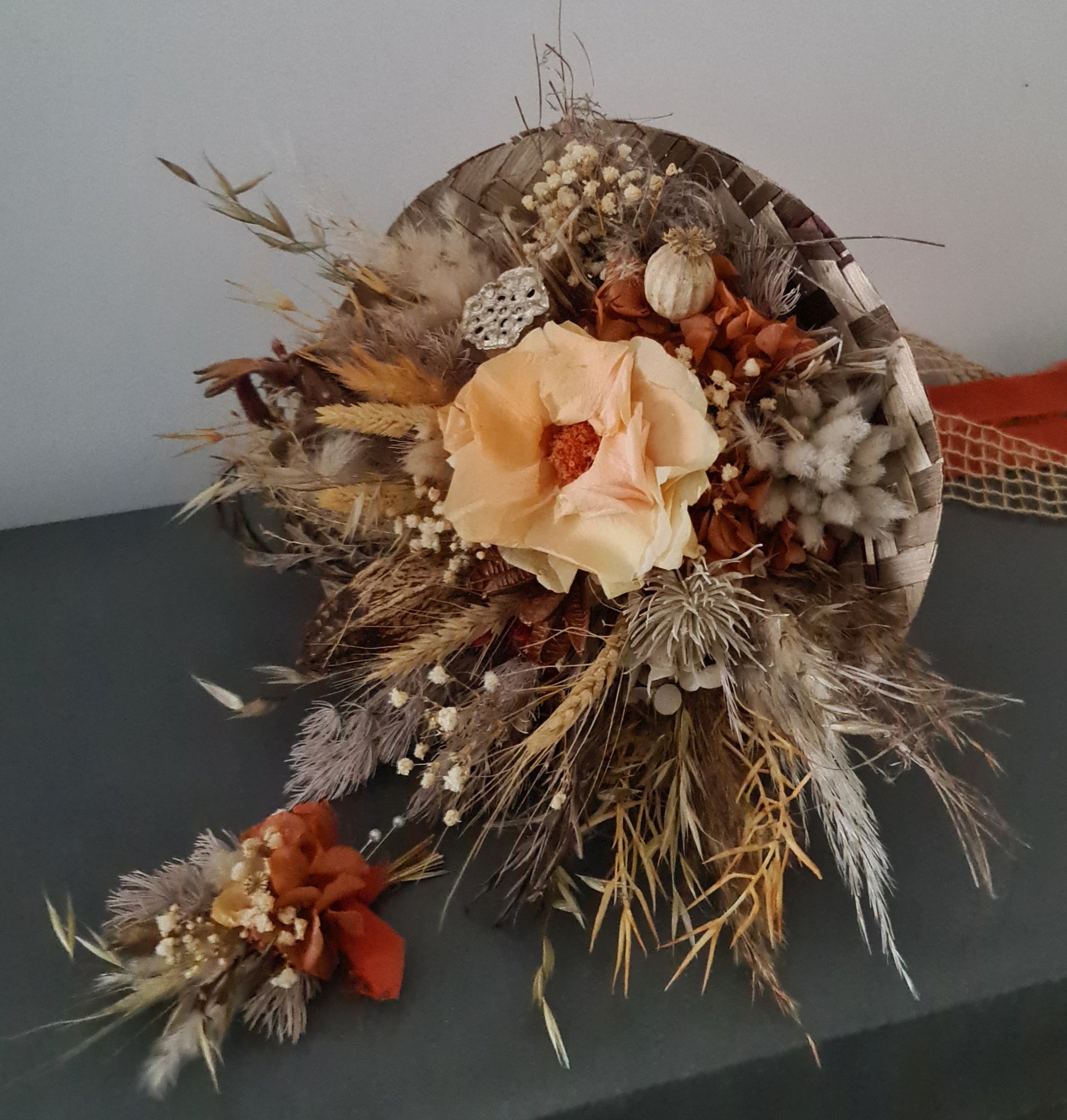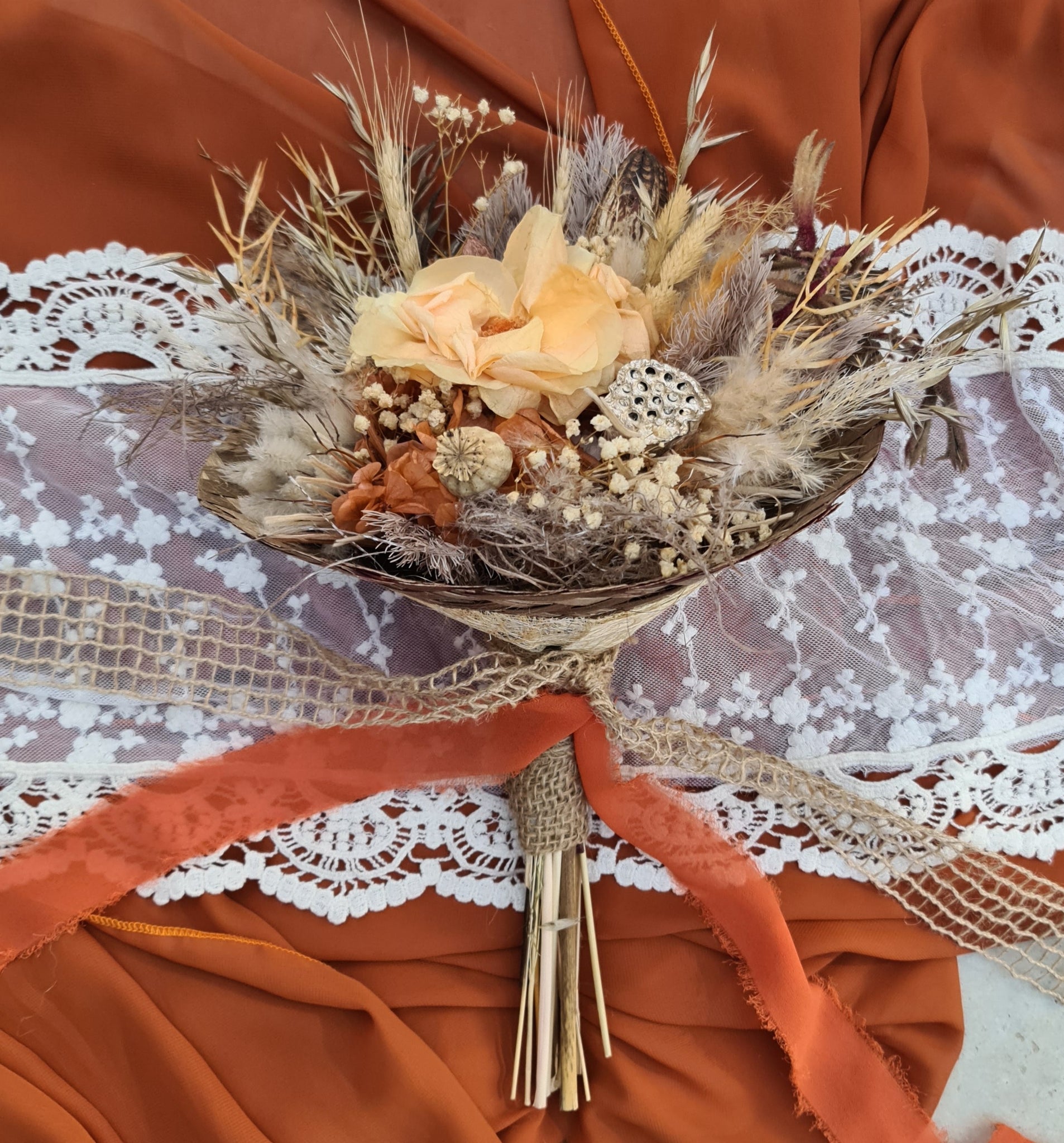 Unique bridal bouquet in rustic style, preserved & dry flowers with champagne gold bouquet collar