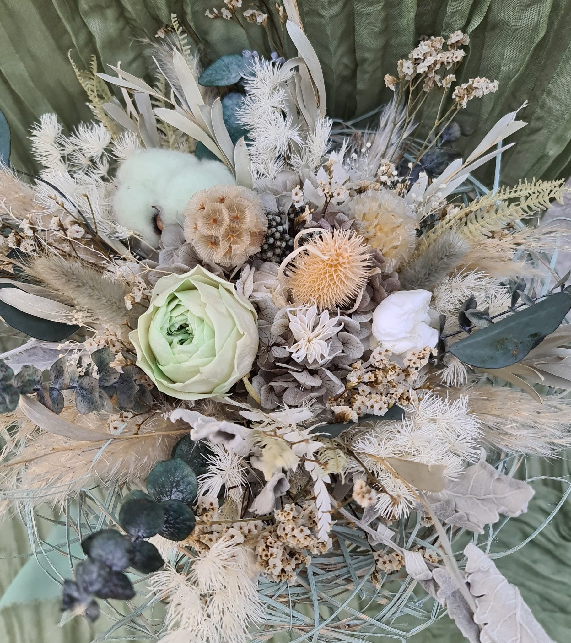 Unique bridal bouquet in sage green, green and neutral colours with preserved peony, scabiosa pod, cotton flower and more. Wrapped up in sage green bouquet collar