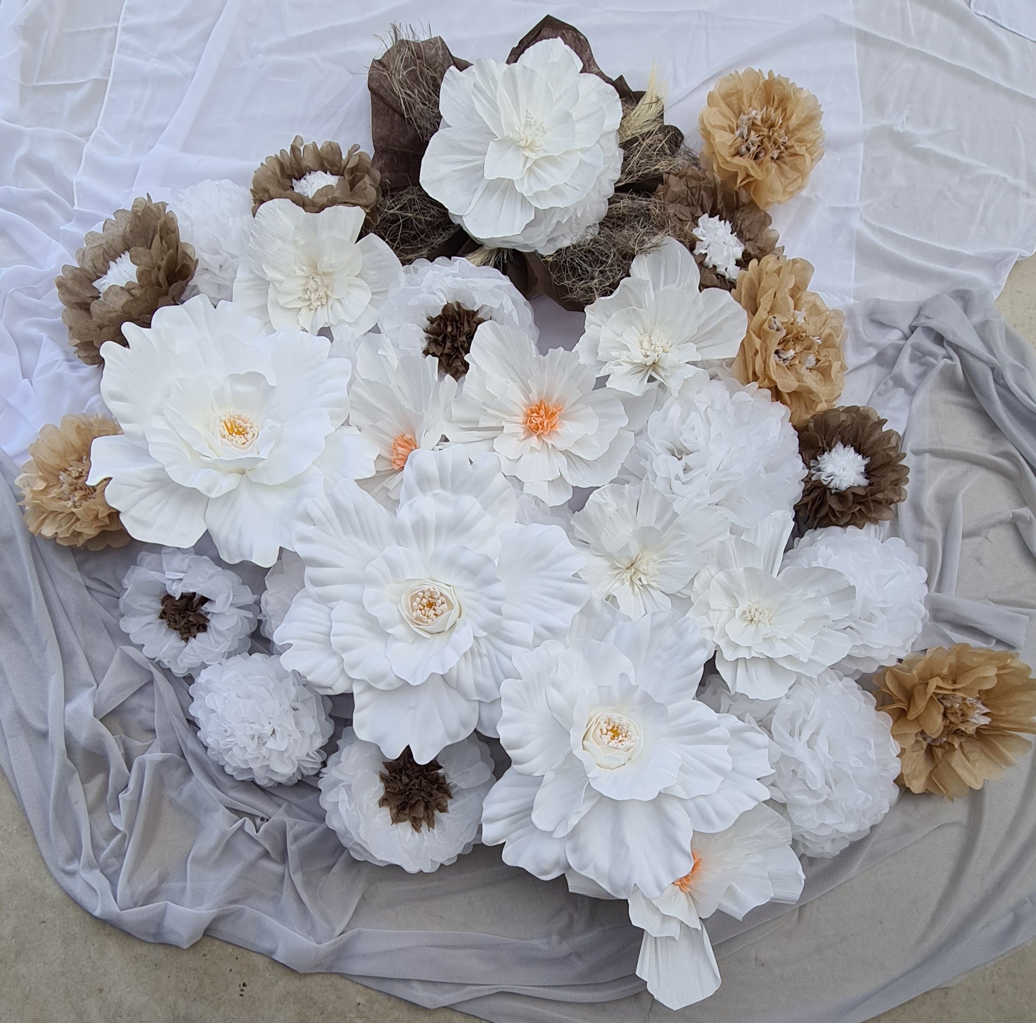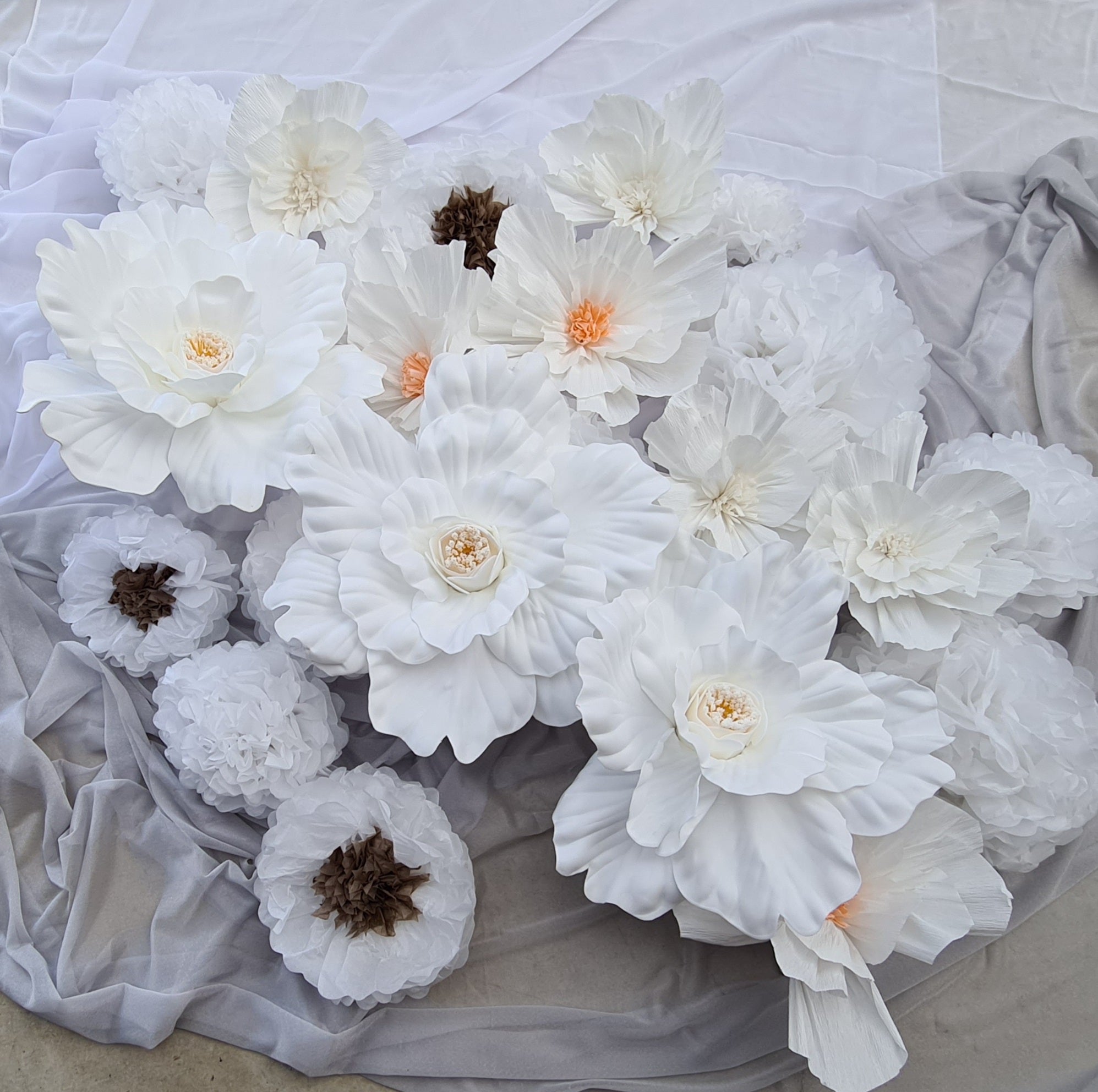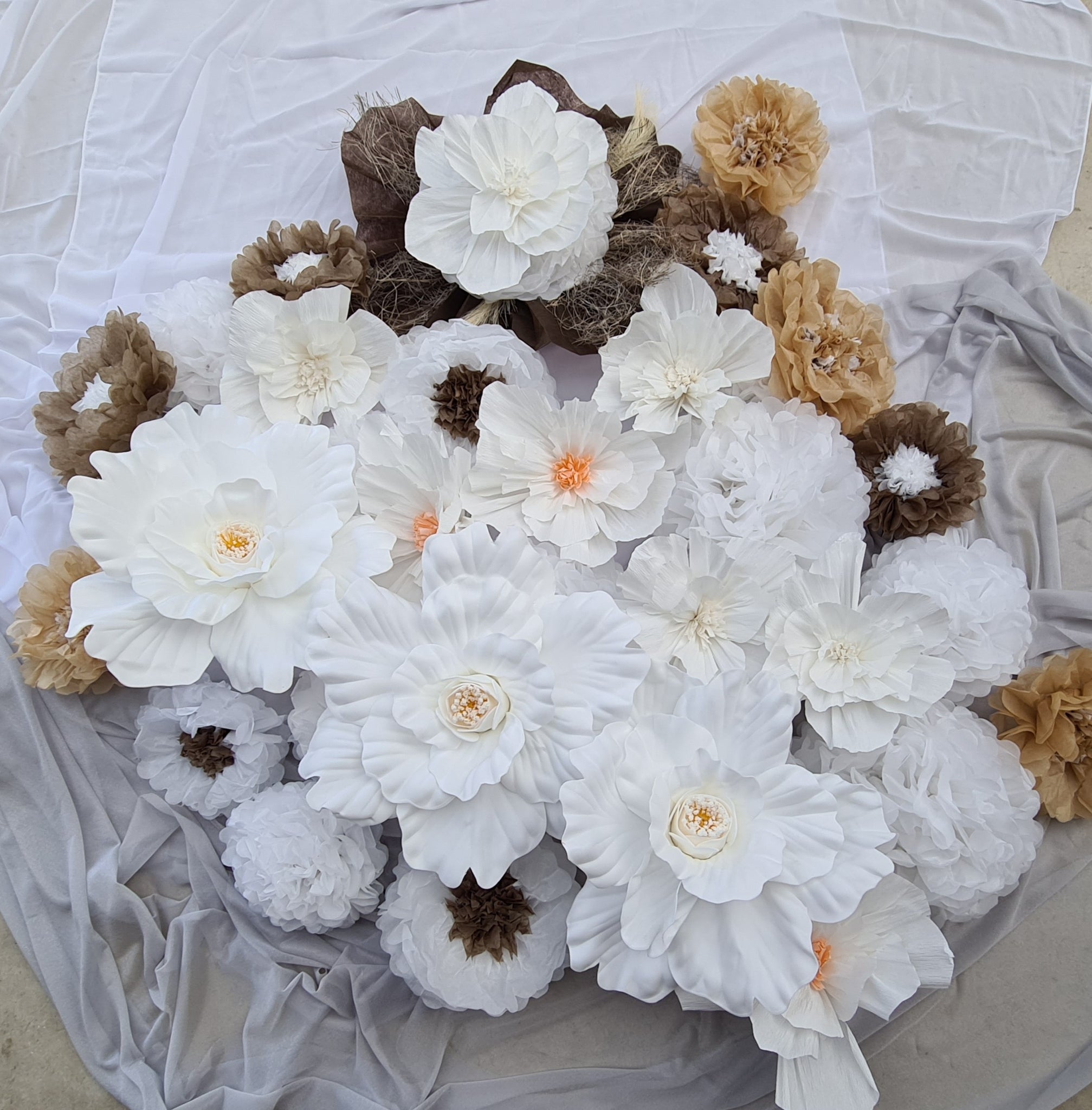 Approximately 20-33 pcs of paper, latex and crepe paper flowers for backdrop, various sizes from 10-40cm