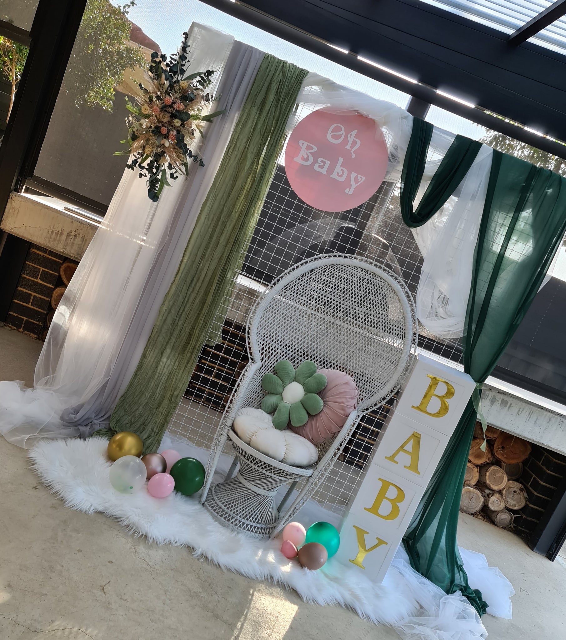 - Green Neutral & Pink Flowers – Welcome sign / easel / small backdrop flowers – (CODE: ABH48) - $45