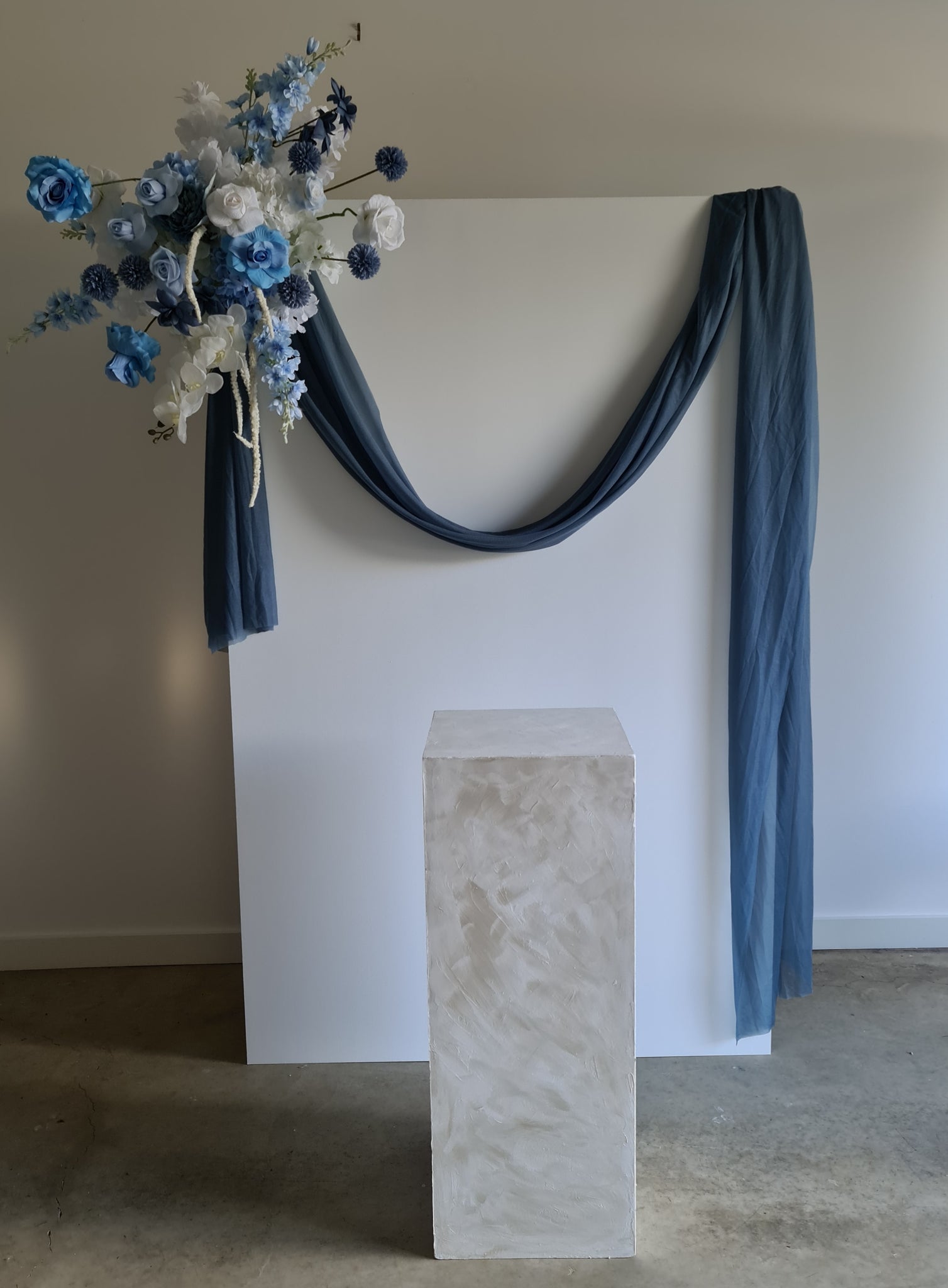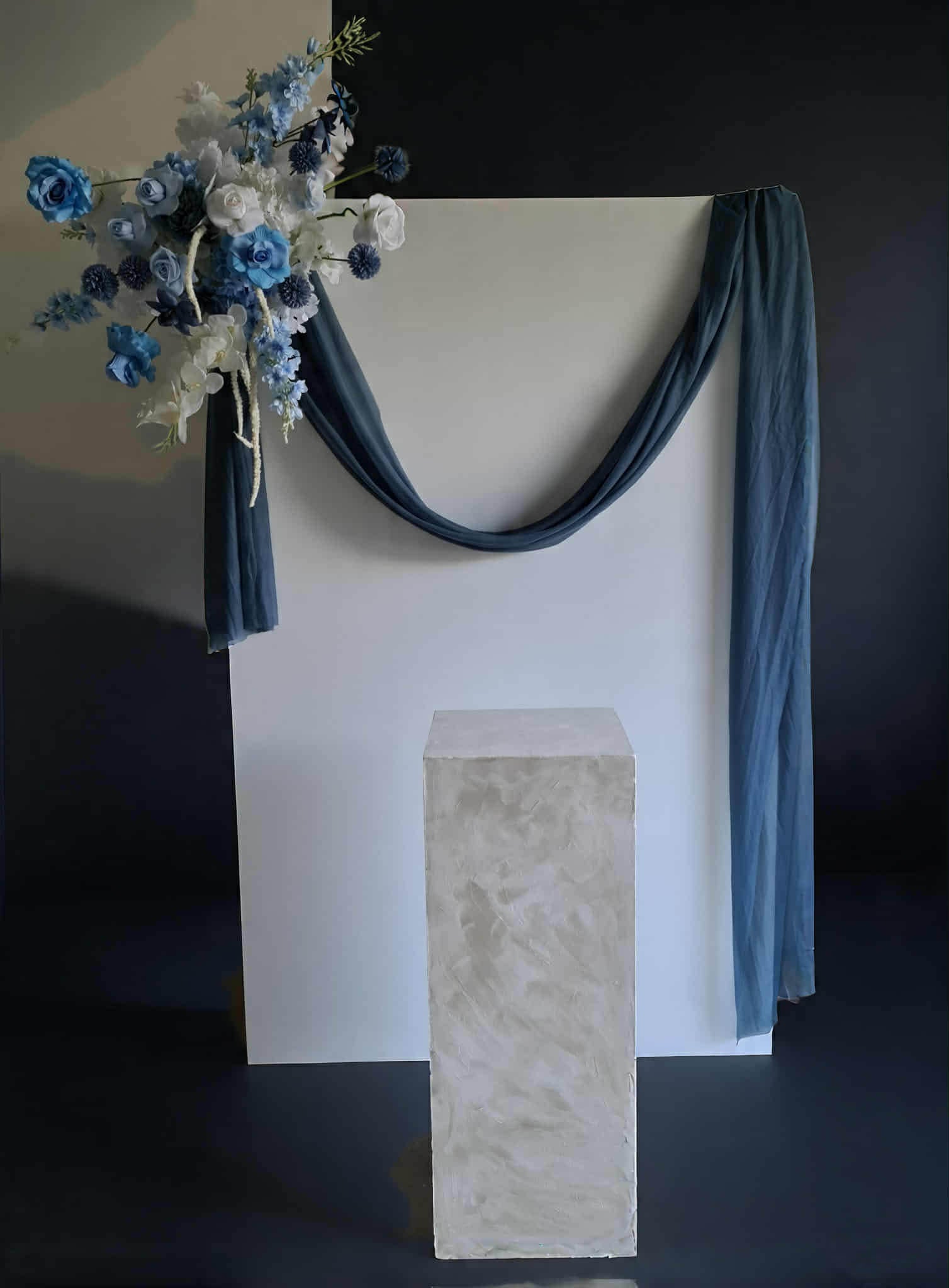 White rectangular backdrop 2.1m, blue flowers & cake stand