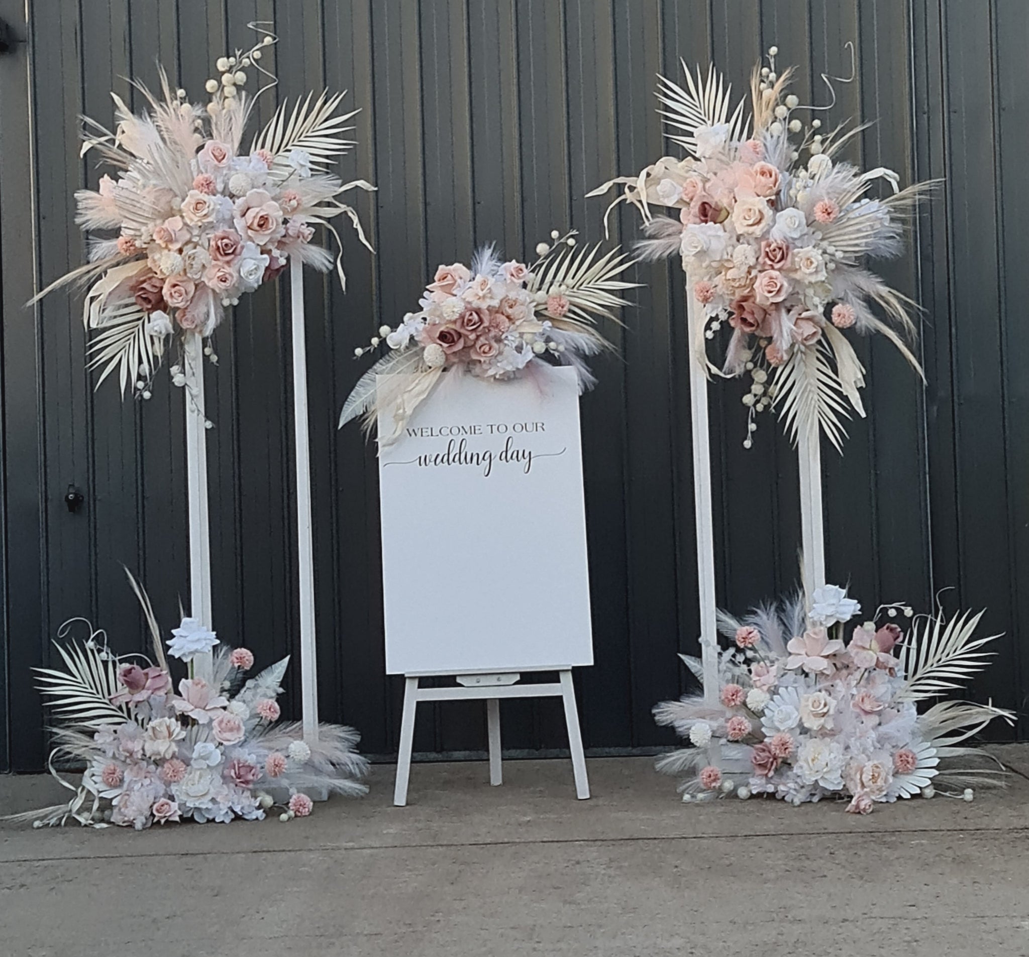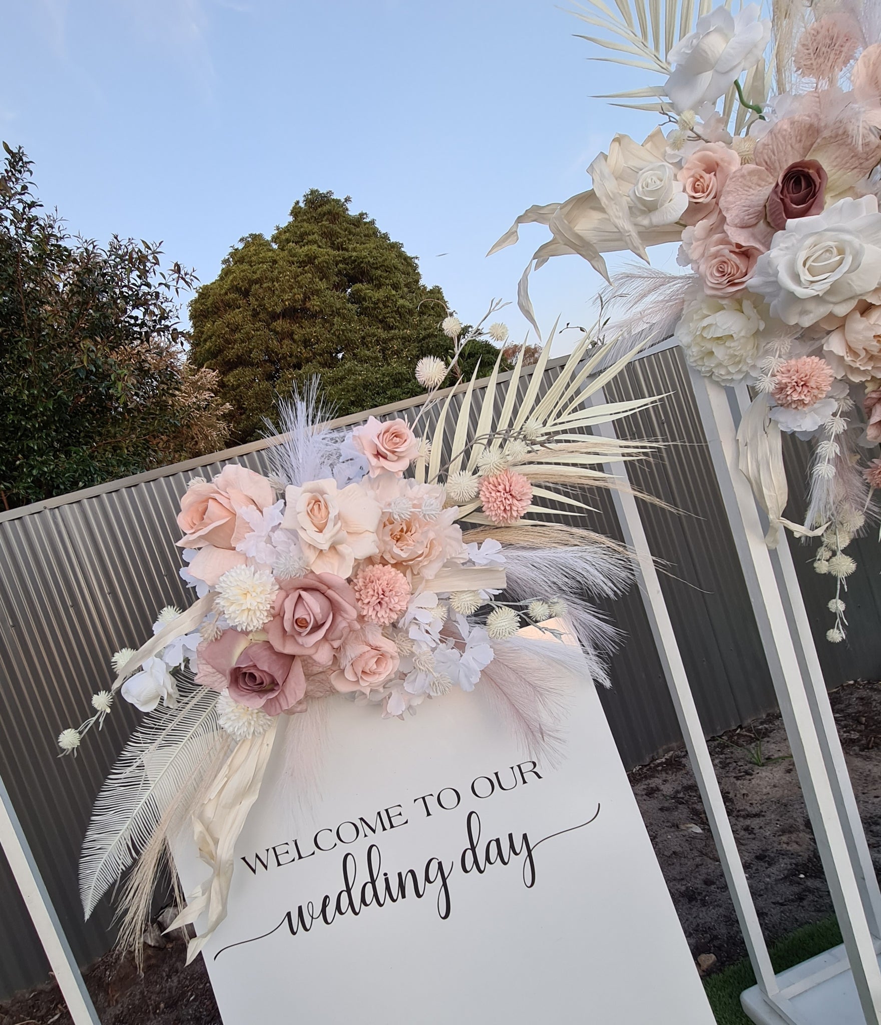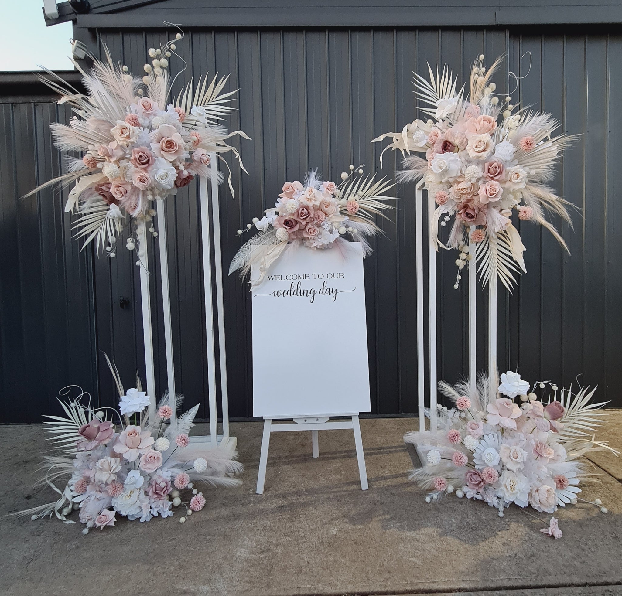 White Stands, Boho blush romantic flowers & welcome sign - Advanced Package