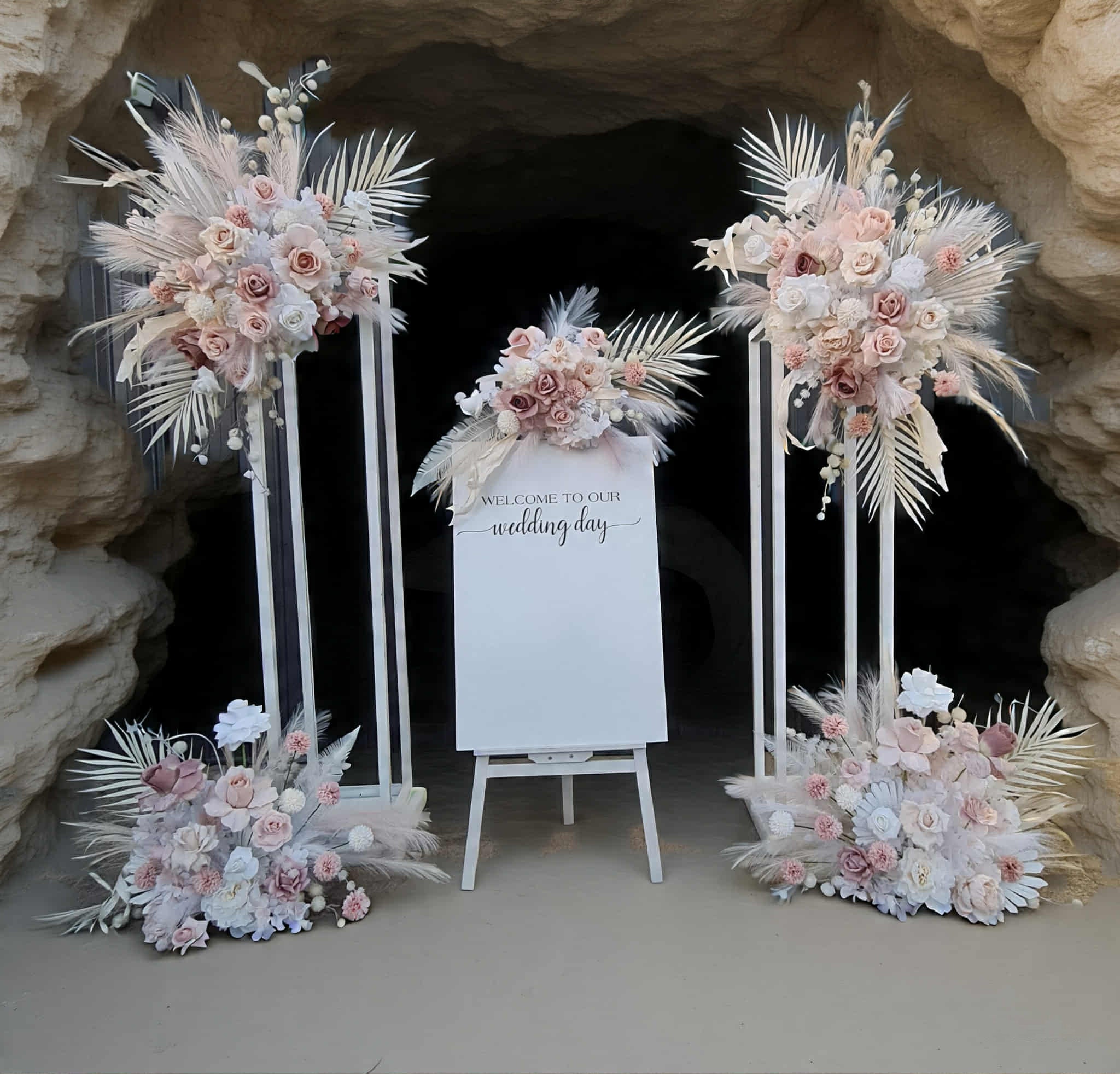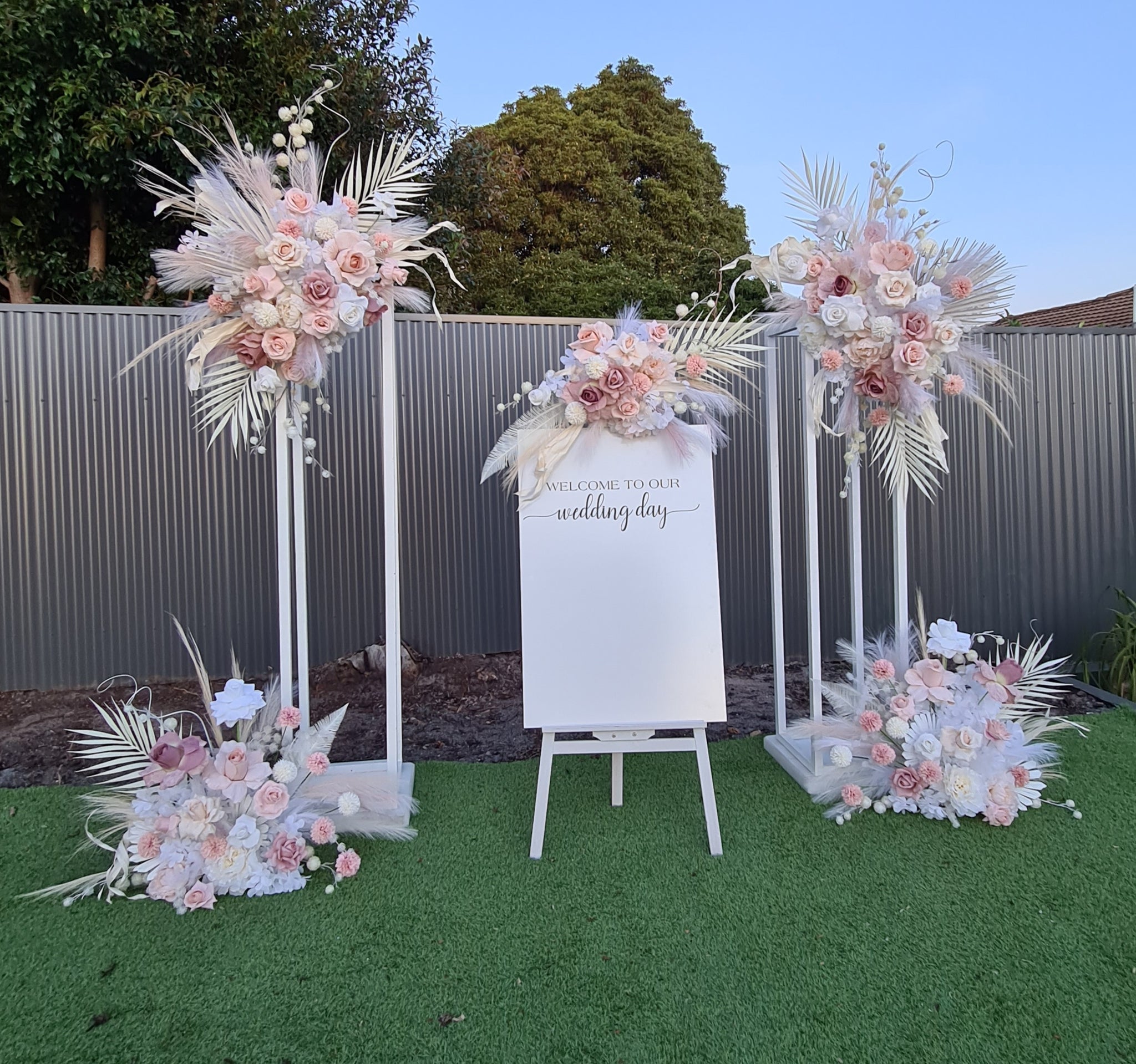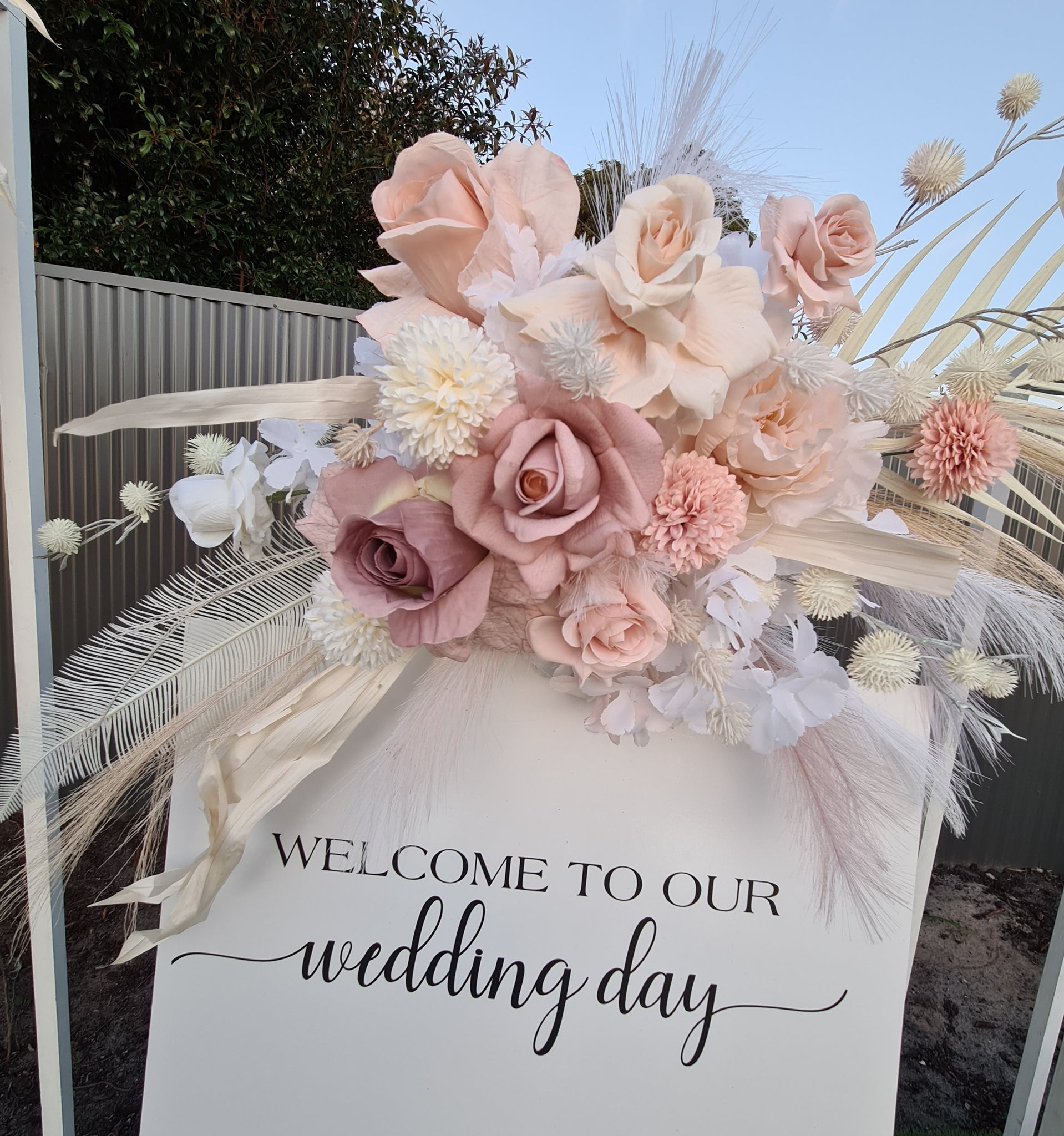 White Stands, Boho blush romantic flowers & welcome sign - Advanced Package