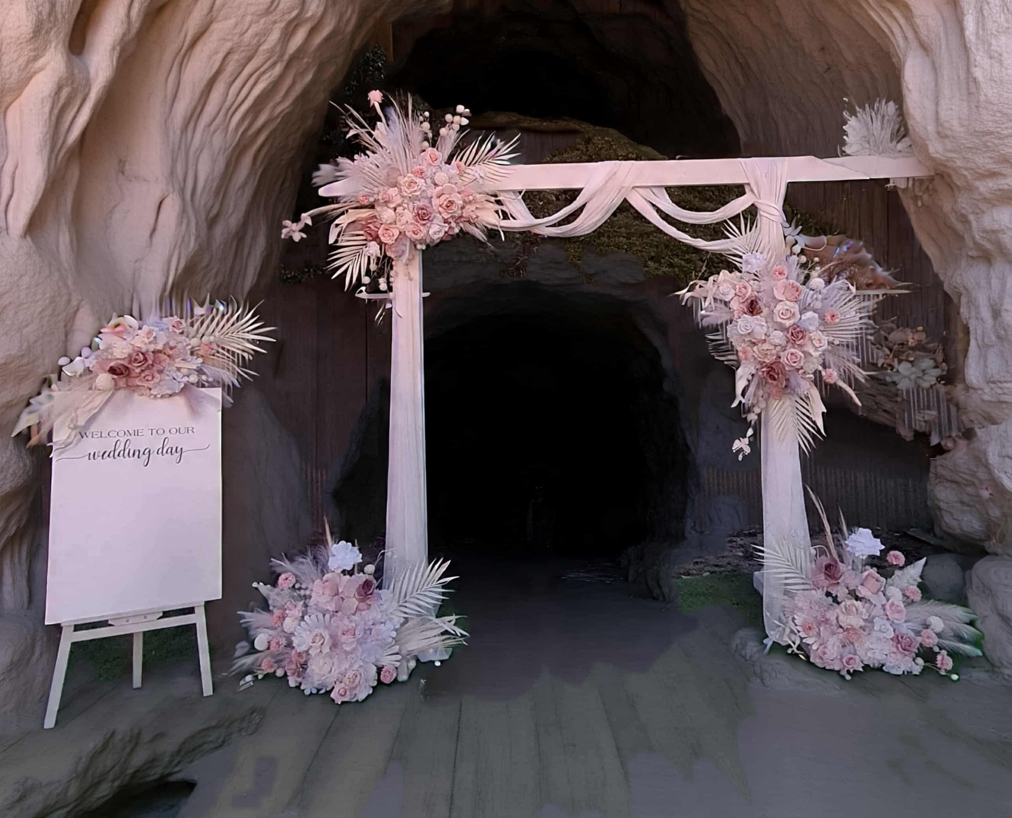 White wood arbour & 5 x Boho blush romantic flowers and easel